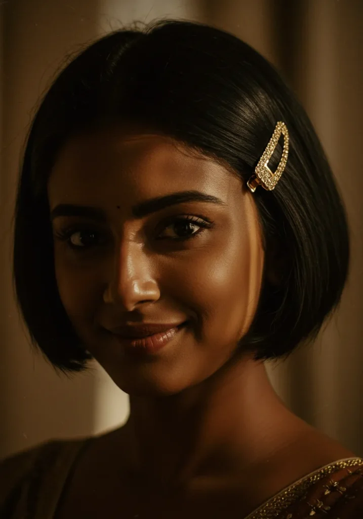 This smooth chin-length bob sits neatly along the jawline, creating a clean and confident silhouette. The hair shines under soft light, and a gold clip placed on one side adds a touch of luxury. The sleek finish makes the whole look feel refined and modern.
