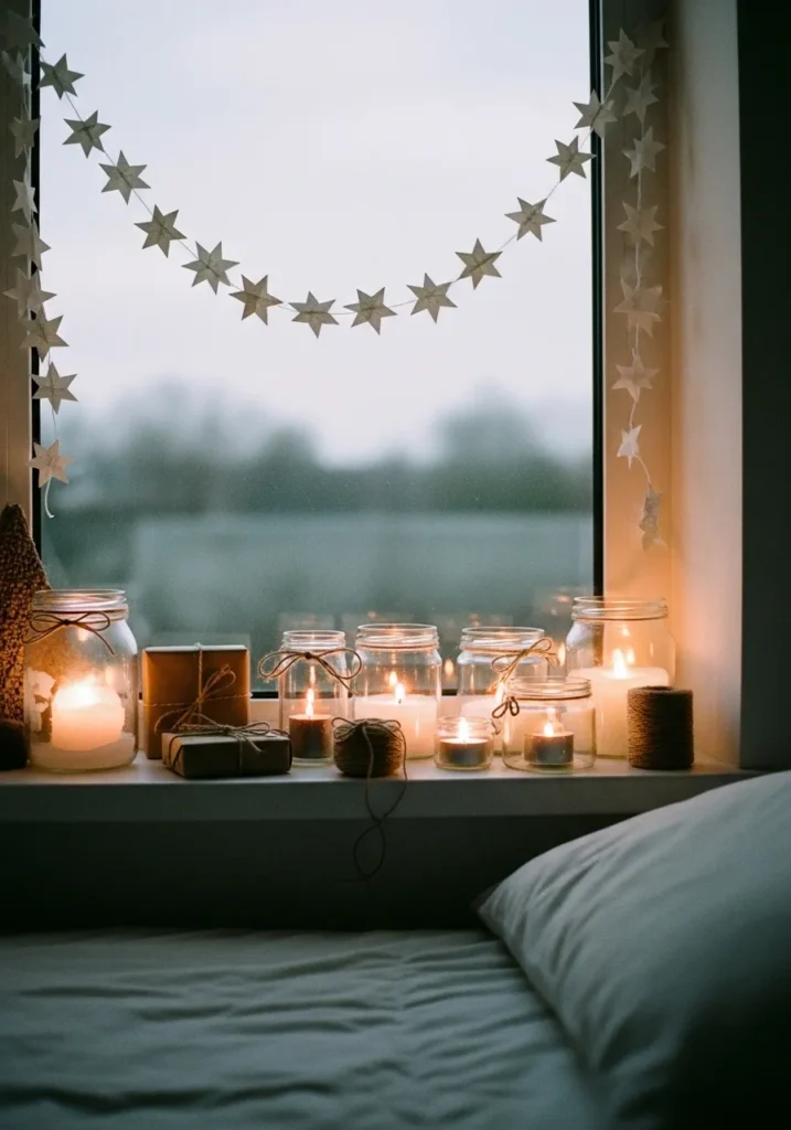This design turns an ordinary window ledge into a soft, glowing nook that feels straight out of a Scandinavian Christmas dream. A mix of simple glass jars, each holding flickering candles, creates that lovely layered light effect that feels both rustic and peaceful. The star garland draped above adds just the right amount of whimsy, while small wrapped gifts and twine details give everything a handmade touch. The setup feels serene, like the kind of cozy corner you’d curl up beside on a quiet December evening.