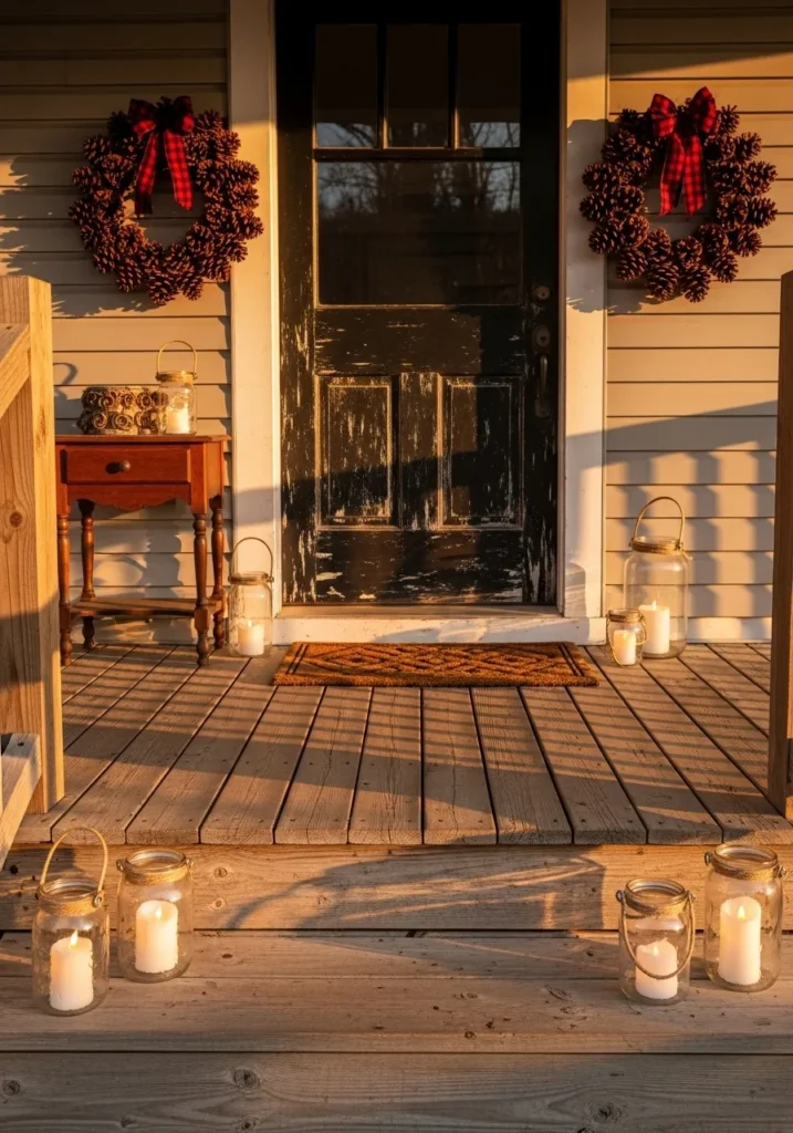 This front porch feels like a cozy Christmas hug, with its mix of glowing candle jars, twin pinecone wreaths, and a perfectly weathered wooden door that tells its own story. The golden-hour light makes every element shine—from the plaid ribbon bows to the warm, flickering candles lined up along the steps. A simple wooden side table and a textured doormat complete the look, giving off a sense of handmade warmth that’s both festive and down-to-earth.