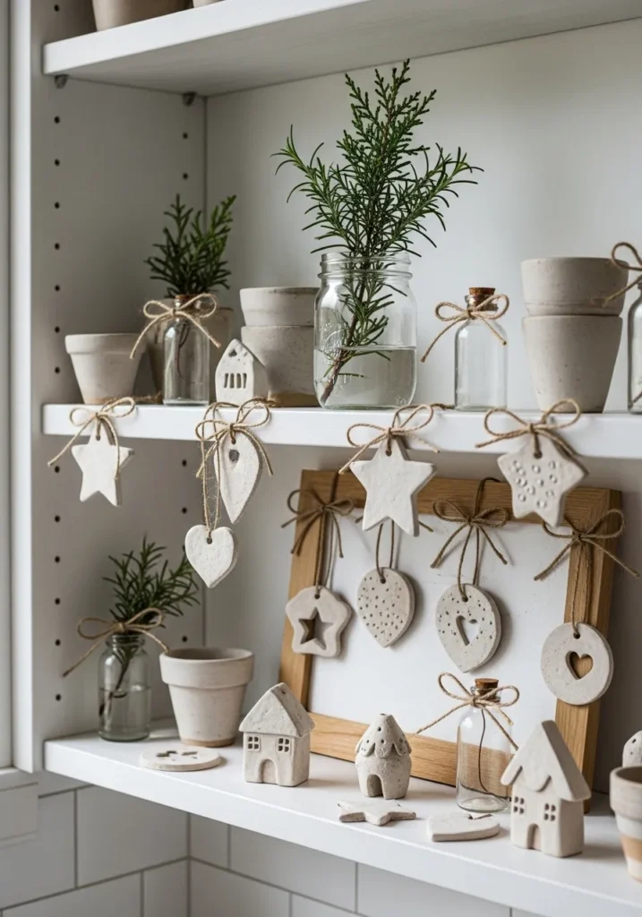 This shelf setup is the perfect mix of earthy and festive. Simple clay ornaments shaped like stars, hearts, and tiny houses are hung on twine bows, creating a handmade charm that feels cozy and personal. Little glass jars hold sprigs of greenery, adding a touch of fresh life among the soft neutrals of the pottery and ornaments. The muted color palette of whites, creams, and natural browns keeps everything looking calm and beautifully understated.