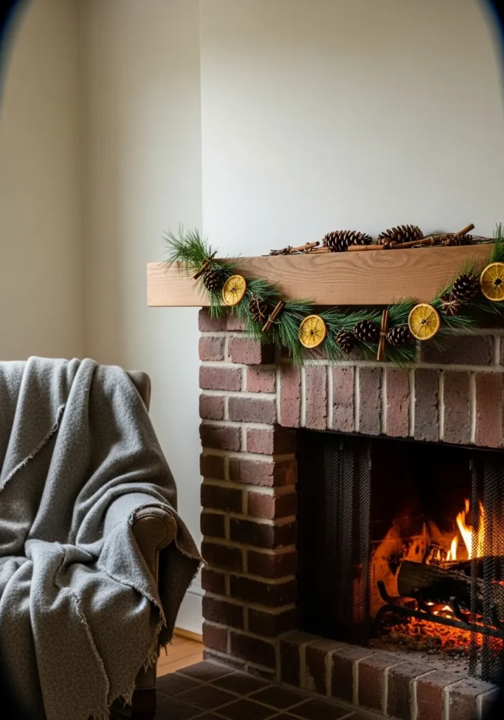 This lovely scene features a simple brick fireplace decorated with the most charming handmade garland. The garland combines dried orange slices, pinecones, cinnamon sticks, and evergreen sprigs for a look that feels both rustic and naturally festive. A soft gray throw draped over a nearby armchair adds that “settle in with cocoa” kind of warmth, while the gentle flicker of the fire makes the whole room glow like a Christmas card brought to life.