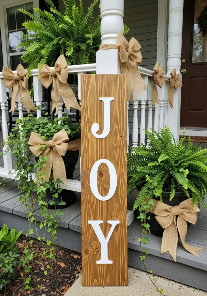 This charming porch design perfectly captures the cozy simplicity of a rustic Christmas welcome. A tall wooden sign with the word JOY painted in crisp white letters leans proudly beside lush green ferns, each pot wrapped with burlap bows to tie the look together. The natural wood tones, greenery, and soft textures create a heartwarming balance of farmhouse charm and holiday spirit without feeling overdone. It’s the kind of décor that feels handmade with love yet looks totally Pinterest-worthy.