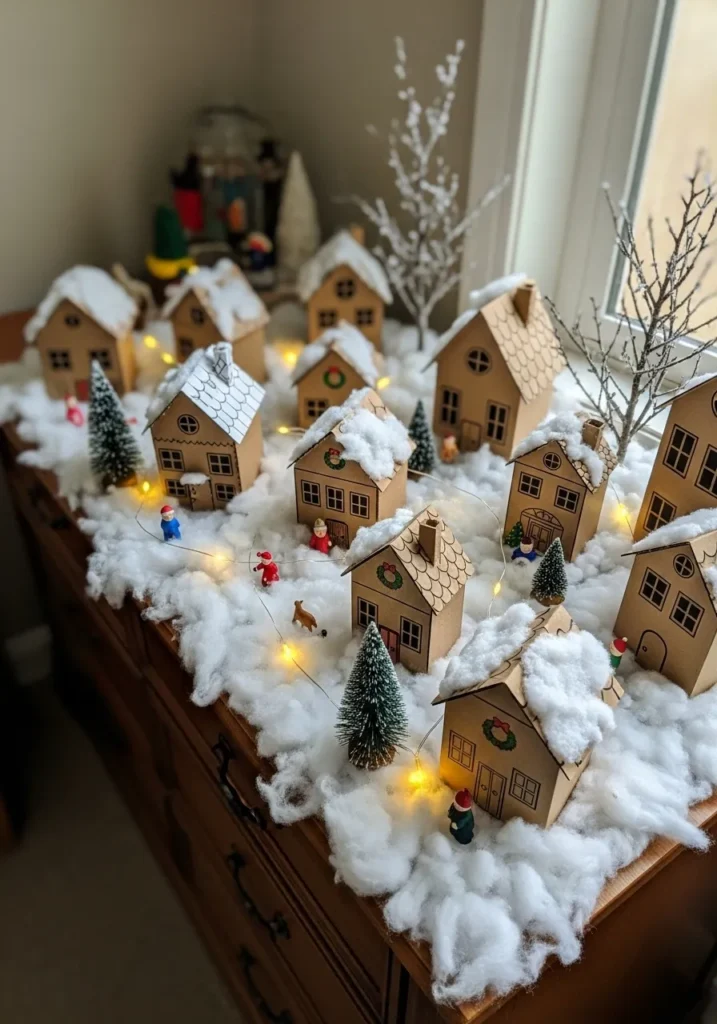 This adorable DIY setup looks like something straight out of a Christmas storybook. A cluster of tiny cardboard houses sits on a blanket of fluffy faux snow, each one detailed with hand-drawn windows, wreaths, and little shingled roofs dusted with white. Mini bottle-brush trees, fairy lights, and small figurines bring the village to life, turning a simple tabletop into a cozy winter wonderland. The soft twinkle of the lights against the cotton snow gives the whole display a dreamy, nostalgic glow that feels both handmade and heartwarming.