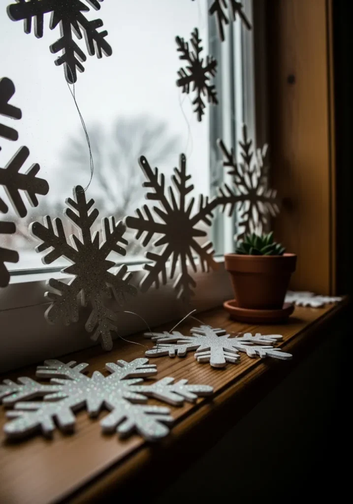 This charming setup brings the magic of a winter wonderland right to your windowsill. Large glittery snowflakes hang gracefully across the glass, catching the light just enough to sparkle like real snow under the morning sun. The contrast of the crisp white snowflakes against the warm wooden frame and tiny terracotta plant pot adds that perfect cozy balance between festive and natural. It’s such a simple DIY idea—just a few cut-out snowflakes, some string, and a touch of creativity can completely transform your window into a dreamy winter scene.