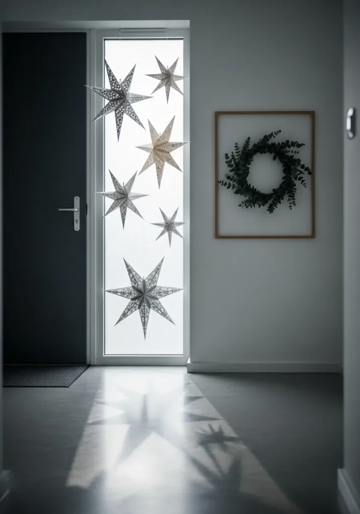 This simple yet stunning entryway design features a cascade of paper stars hung gracefully in front of a frosted glass door. Each star varies in size and tone, from silver shimmer to soft ivory, creating a dreamy constellation effect as daylight filters through. A minimalist eucalyptus wreath framed neatly on the wall balances the scene with a touch of greenery, while the soft shadows on the floor add quiet elegance to the space. It’s modern, clean, and just the right amount of festive without going overboard.