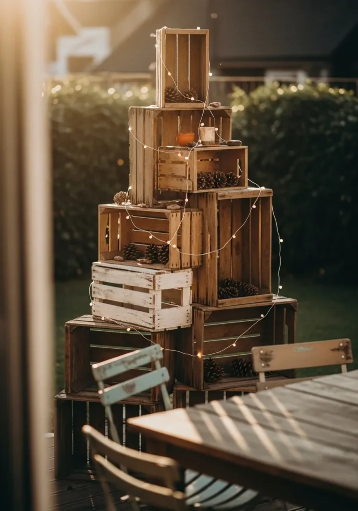 This creative outdoor setup uses stacked wooden crates to form a charming rustic “tree” that feels both cozy and eco-friendly. Each crate is arranged in a tiered pyramid shape, filled with pinecones, candles, and twinkling fairy lights that glow beautifully as the sun sets. The mix of natural wood tones with a few distressed white crates adds that perfect farmhouse balance between worn and whimsical. It’s the kind of design that feels effortlessly festive without looking overdone.