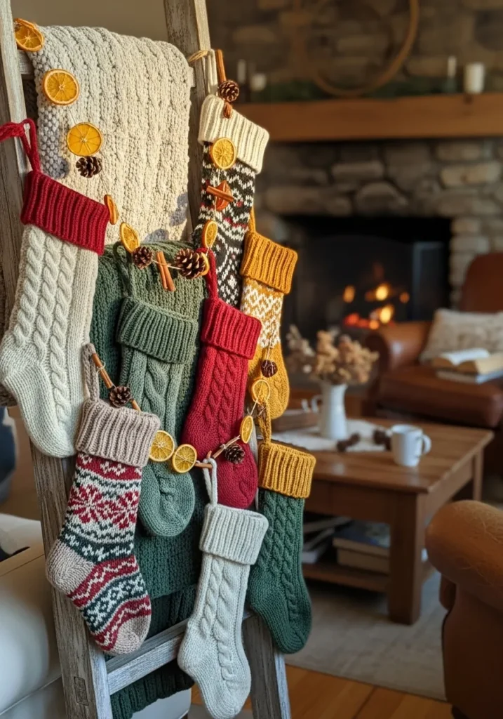 This charming setup features a rustic wooden ladder draped with chunky knit stockings in shades of cream, red, green, and mustard. Each stocking is uniquely patterned, some with classic cable knits and others with festive Fair Isle designs. The ladder leans casually against a cozy corner, decorated with dried orange slices, pinecones, and cinnamon sticks that add a natural, homemade touch. The background glow from the fireplace makes the whole scene feel like a warm holiday hug.