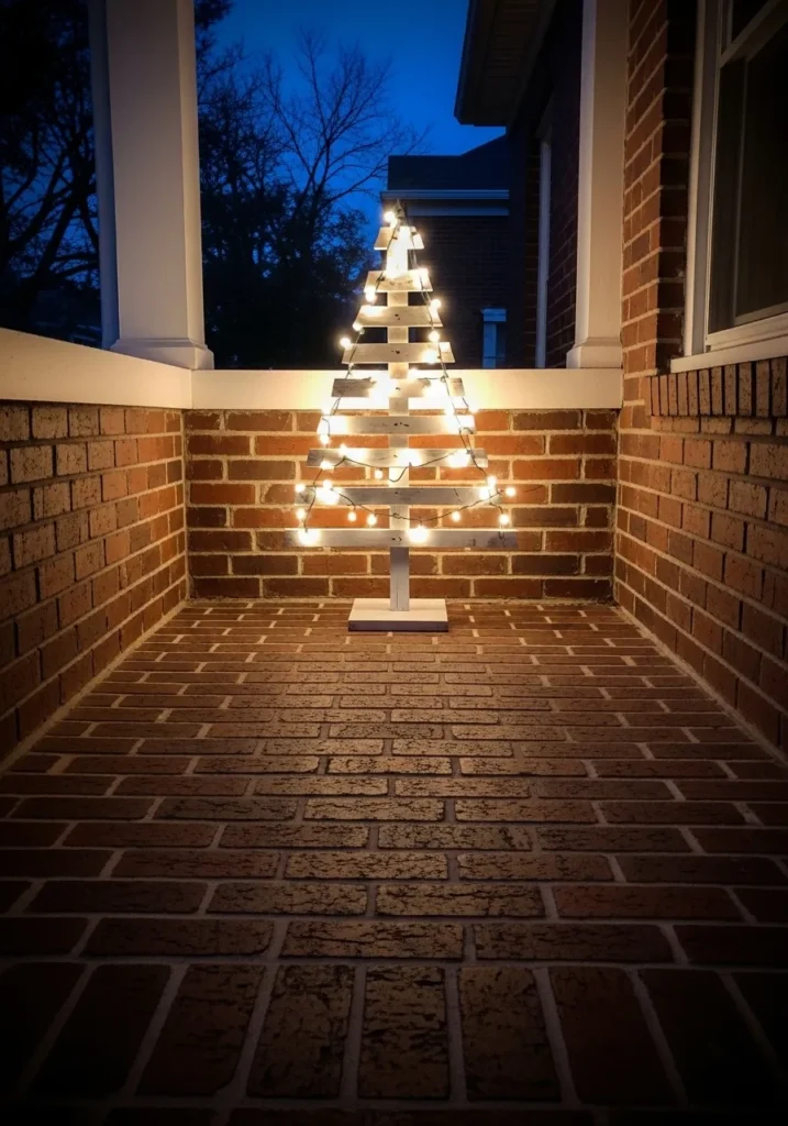 This cozy little setup turns simplicity into pure Christmas magic. It features a handmade wooden tree made from painted slats, stacked neatly in a triangular shape and wrapped in warm white string lights. The glow against the red brick wall feels soft and welcoming, perfect for a small porch or balcony corner. It’s one of those designs that makes you smile the second you see it because it’s so effortlessly festive without any fuss or clutter.