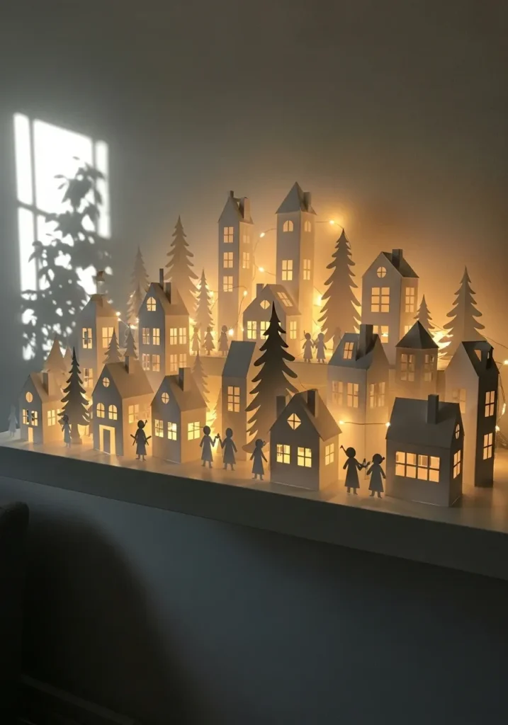 This cozy little paper village looks like something straight out of a Christmas storybook. Each tiny house and pine tree is carefully crafted from white cardstock, and soft golden fairy lights tucked behind them bring the whole scene to life. When the lights are turned on, the windows glow warmly, casting magical shadows across the wall like a quiet winter evening in a snowy town. The simplicity of the design—just white paper, soft light, and a bit of creativity—makes it even more charming and achievable for anyone who loves crafting.