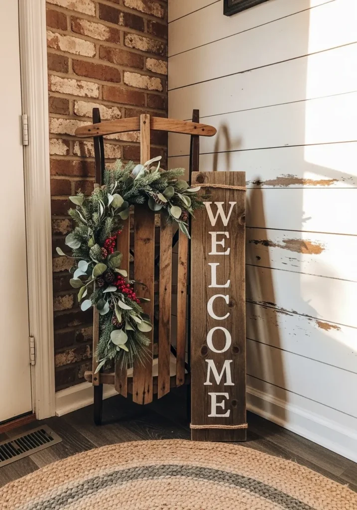 This charming little setup instantly makes an entryway feel warm and personal. A vintage wooden sled leans casually against a white shiplap wall, paired with a vertical “Welcome” sign made from reclaimed wood. The sled is dressed with a simple yet elegant greenery wreath, complete with pine sprigs, eucalyptus leaves, red berries, and a few rustic pinecones. Soft natural light highlights the texture of the brick wall and the cozy braided rug below, giving the space that perfect blend of farmhouse nostalgia and Christmas cheer.