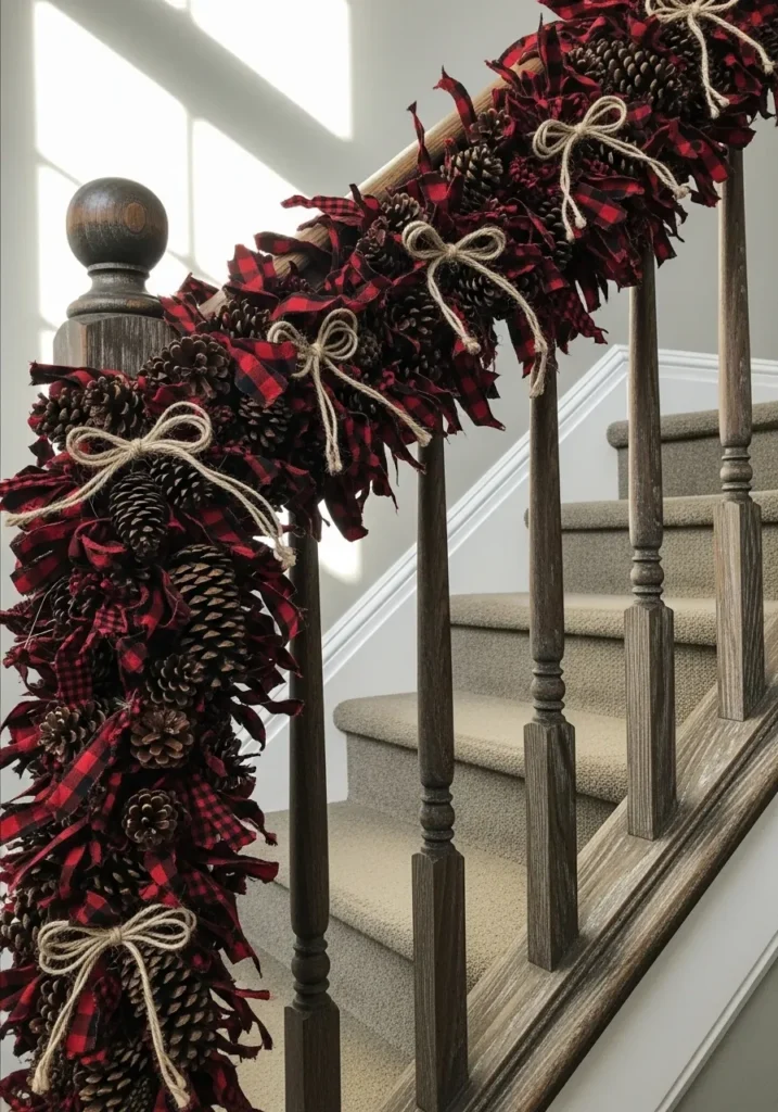 This staircase decor brings all the cozy lodge feels right to your home. A simple railing is transformed with a lush garland made from pinecones, buffalo plaid fabric strips, and twine bows. The mix of deep red and black checks with the natural brown tones of pinecones creates that perfect rustic-meets-festive look. It’s the kind of detail that makes your whole home smell like winter woods and look straight out of a Christmas cabin.