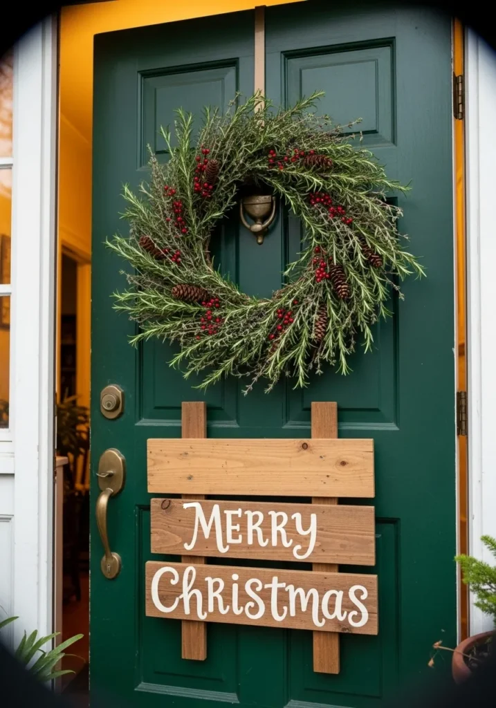 This cheerful front door setup features the kind of timeless holiday charm that makes every guest feel instantly at home. A lush wreath made of real-looking greenery, pinecones, and bright red berries hangs proudly against a classic green door, creating a perfect balance of color and texture. Just below it, a handmade wooden sign with the words “Merry Christmas” painted in white adds a cozy rustic touch. The mix of natural materials and warm, glowing light from inside the house gives the whole entryway that storybook Christmas feel.