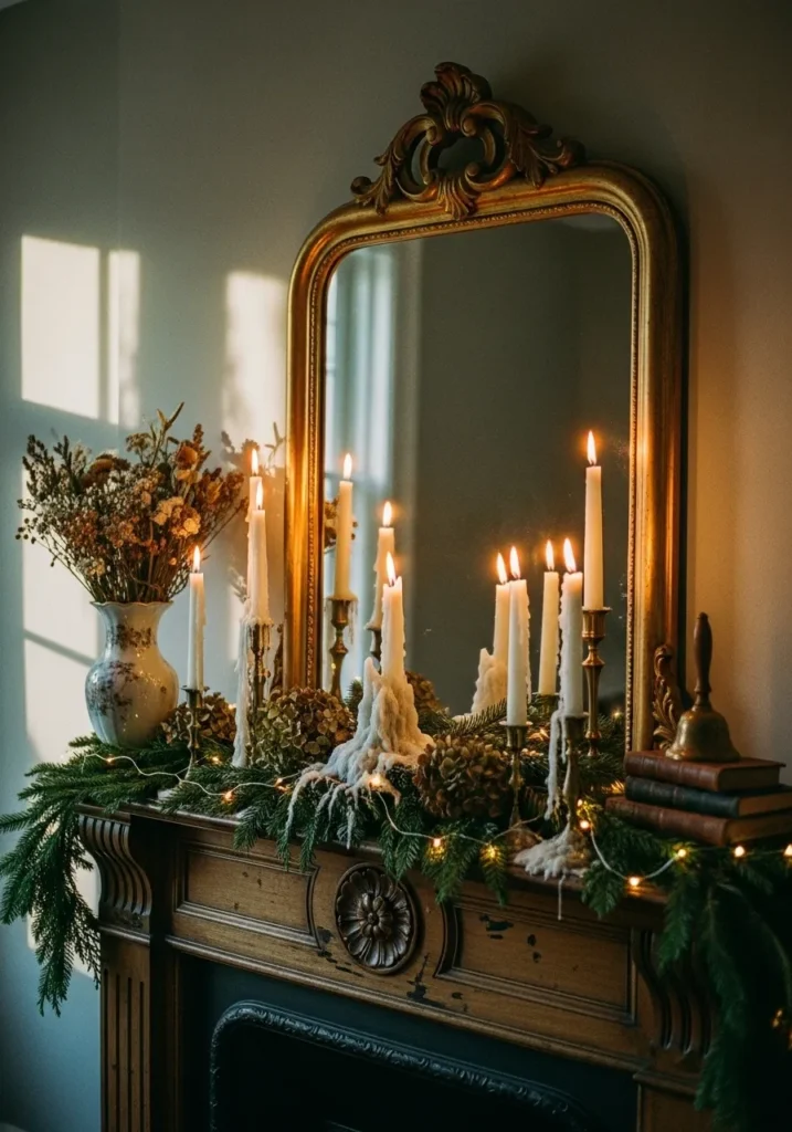 This charming vintage mantel setup looks like it’s straight out of a timeless Christmas postcard. The golden ornate mirror steals the show, reflecting the warm flicker of tall white candles perched on brass holders. A lush garland of evergreens and dried hydrangeas rests along the mantle, intertwined with soft fairy lights that make everything shimmer gently in the evening light. A classic ceramic vase filled with dried blooms and a small stack of weathered books complete the look, giving the whole space that perfectly aged beauty that never goes out of style.