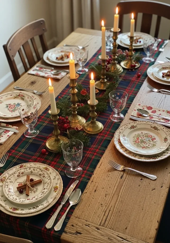 I adore this setup because it feels so timeless and homey. The mix of plaid, brass, and flickering candlelight gives it that warm, nostalgic glow that makes you want to linger over dessert just a little longer. It’s that perfect blend of elegance and coziness that reminds me of Christmas dinners where stories flowed as easily as the mulled wine.