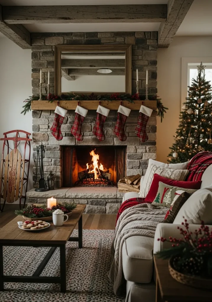 This cozy living room feels like stepping straight into a Christmas card from the 1950s. The stone fireplace sets the heartwarming tone, framed with wooden beams showing just the right amount of age and character. Plaid stockings hang in a neat row, while a small evergreen twinkles softly in the corner. A pair of armchairs draped in tartan blankets and a vintage wooden sled tucked by the window make the whole space feel like the kind of room where you’d sip cocoa and listen to old holiday records.
