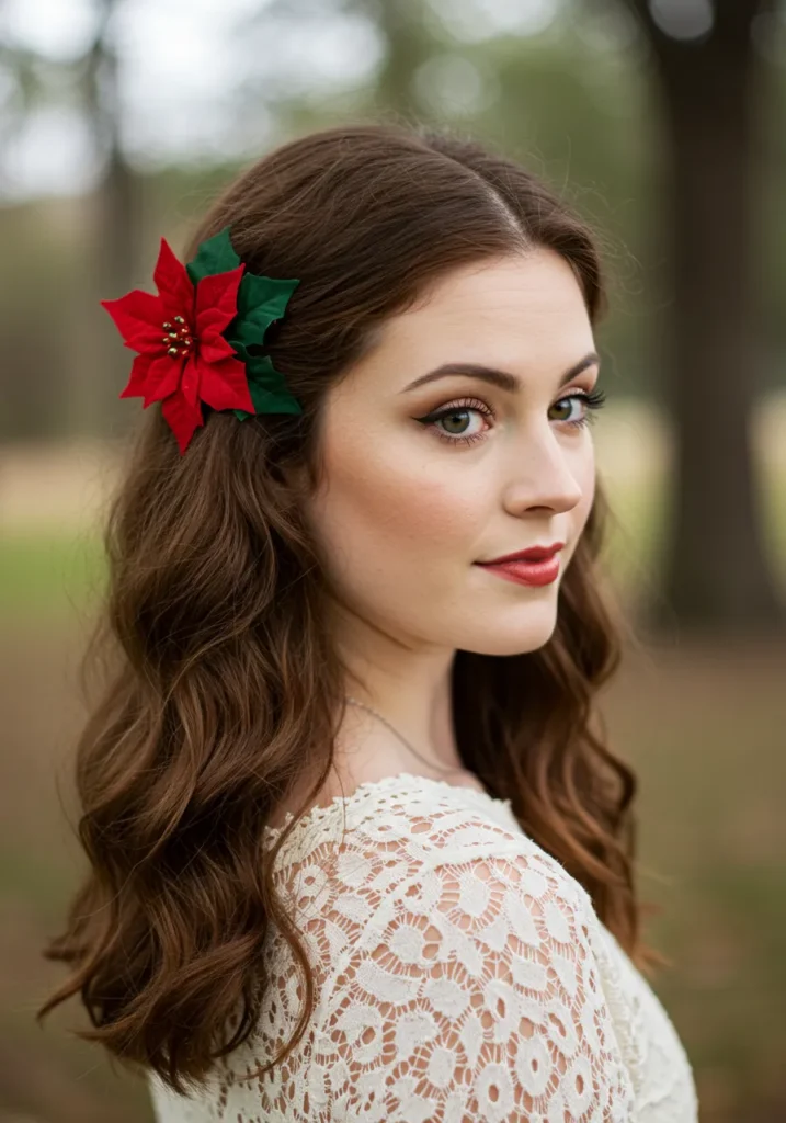 Soft, vintage-inspired waves tumble down long brunette hair, with a bright red poinsettia clip tucked to one side. The texture is smooth and defined, giving off cozy, timeless elegance with a playful holiday flair.