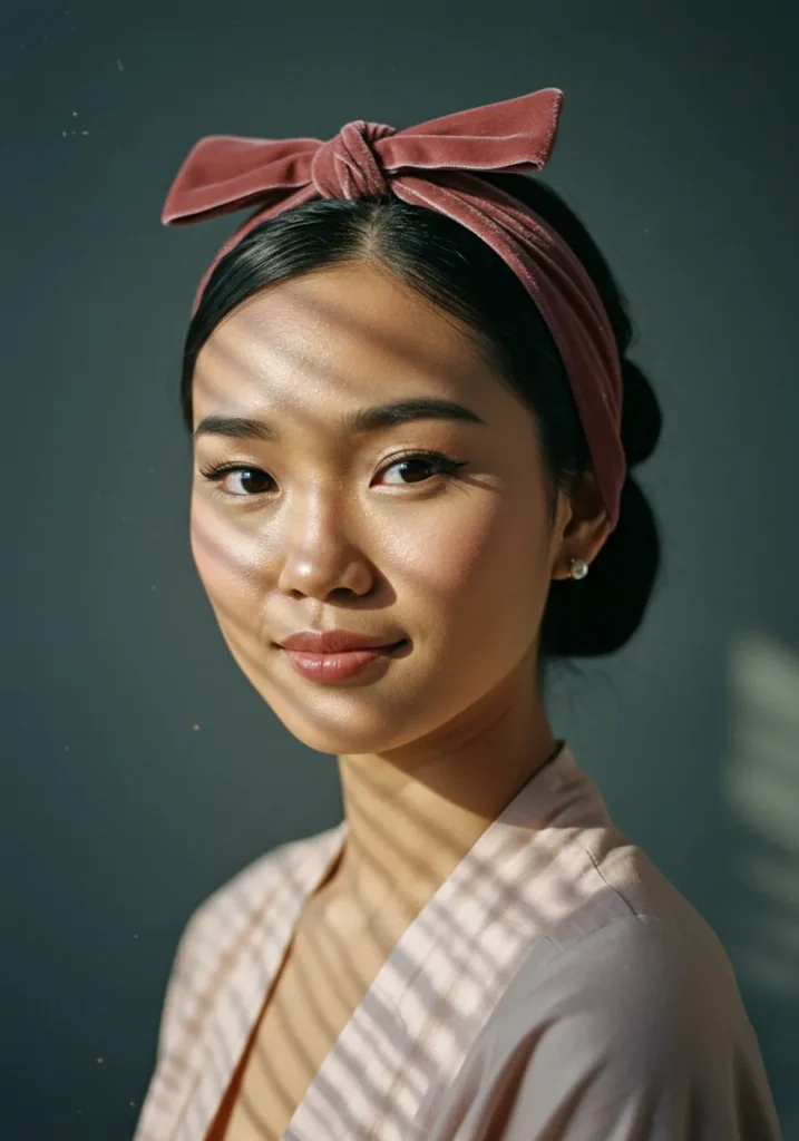 Long, sleek hair is swept back into a smooth low bun, topped with a wide velvet headband tied into a soft bow. The texture is polished and shiny, giving the hairstyle that perfect mix of modern and classic charm.