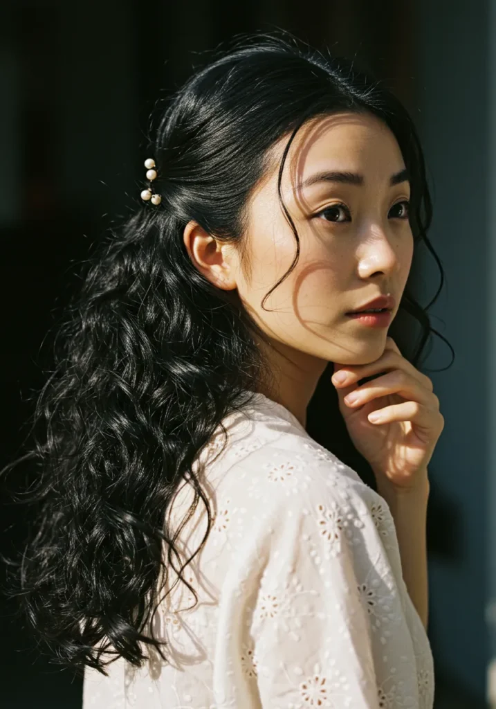 This hairstyle features long, glossy black waves pinned softly at the back with tiny pearls that glimmer delicately in the light. The hair has natural texture and movement, creating a romantic, timeless look that feels perfect for any holiday setting.