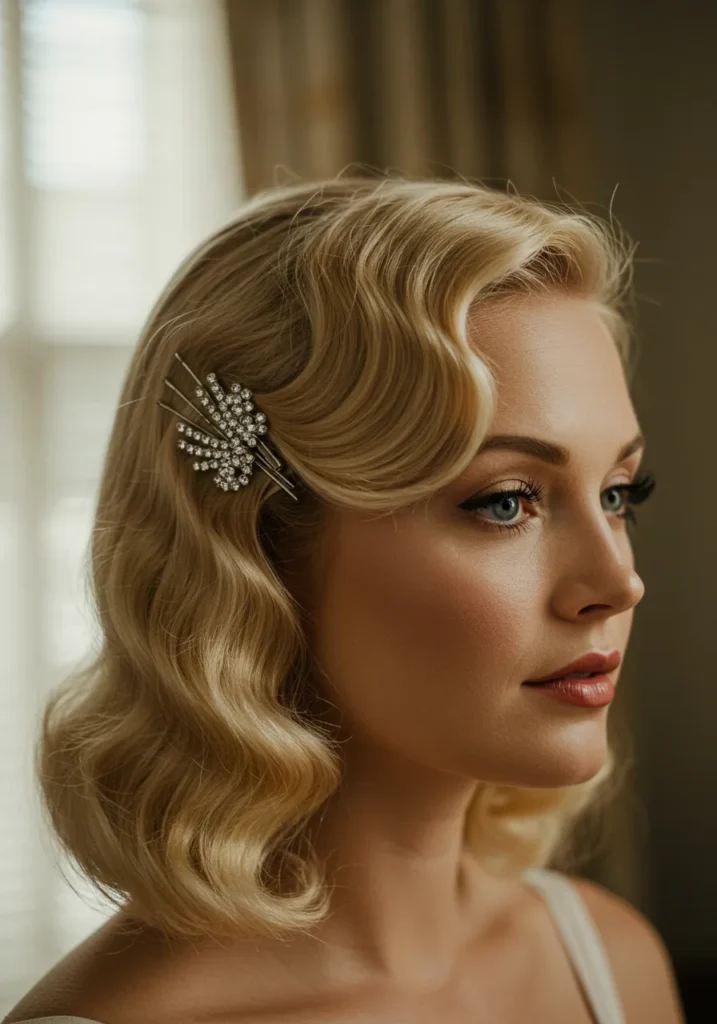 Soft, sculpted waves define this retro-inspired blonde look, giving off major old-Hollywood glamour. The curls are glossy and perfectly set, with a sparkly crystal clip tucked on one side to catch the light just right.