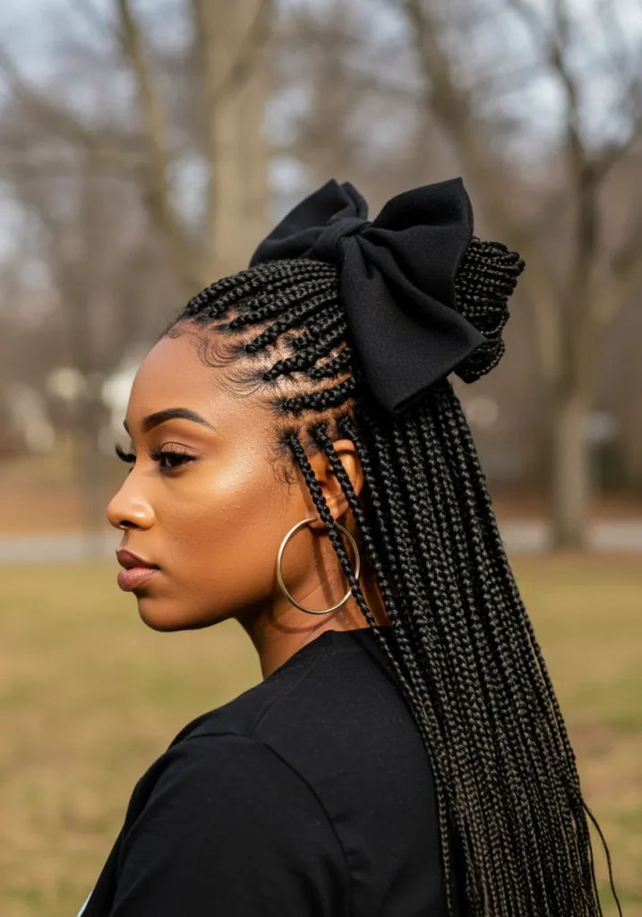 Long, neat braids are pulled back into a half-up ponytail tied with a dramatic black bow. The look is sleek and defined, yet full of volume and personality. The clean lines of the braids contrast beautifully with the soft texture of the bow, making it a total statement style.