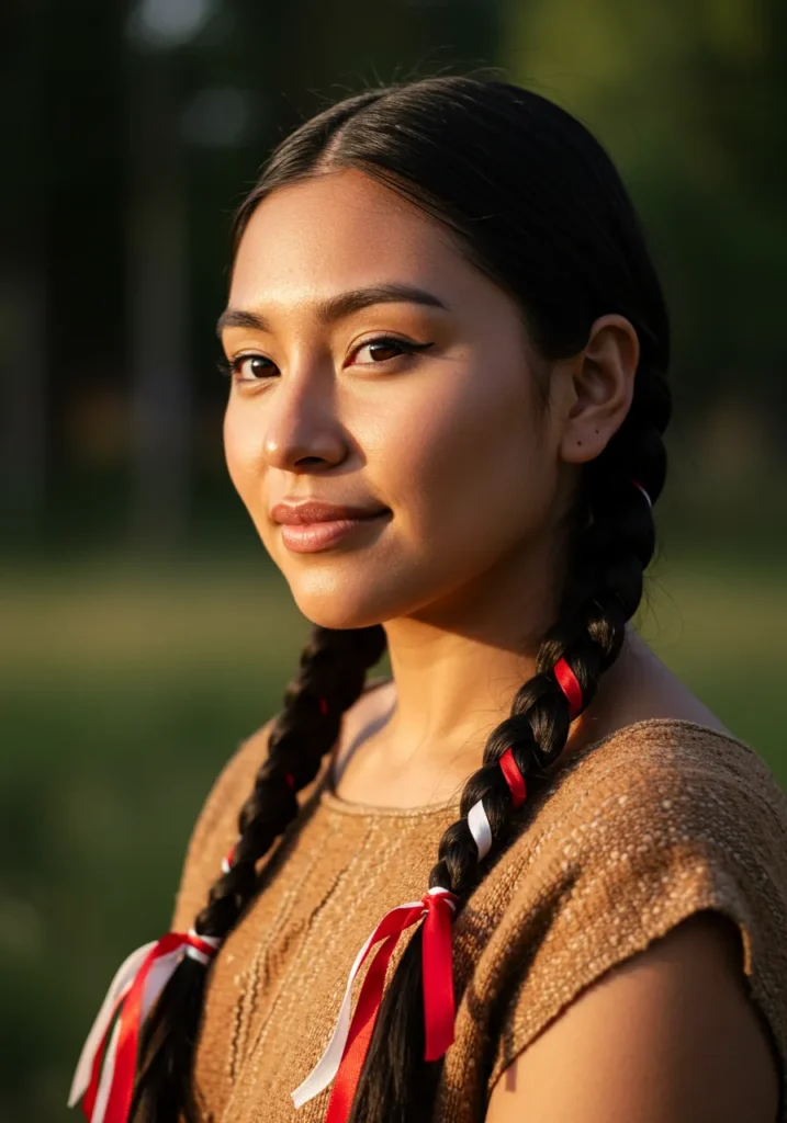 Smooth, dark hair is parted neatly and styled into two long braids, each tied with alternating red and white ribbons woven throughout. It’s simple, classic, and gives off cozy Christmas morning vibes.