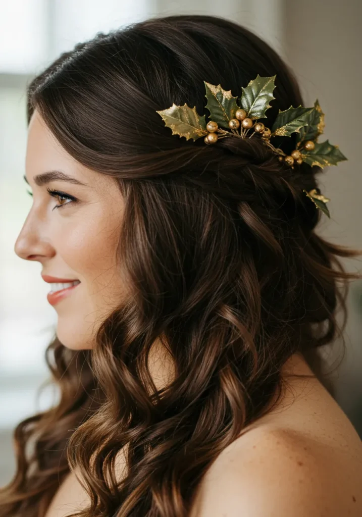 Soft, romantic waves cascade down, gathered slightly at the back with a delicate golden holly accessory. The warm brown tones of the hair pair perfectly with the metallic gold, creating a rich, elegant finish.