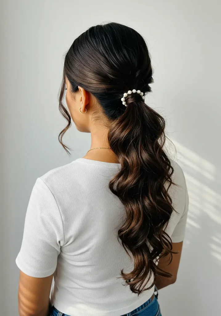 Long, glossy brown waves are tied low at the nape with a pearl-embellished band, creating a timeless look with a touch of glam. The soft tendrils around the face make it feel feminine and easygoing while still looking polished.
