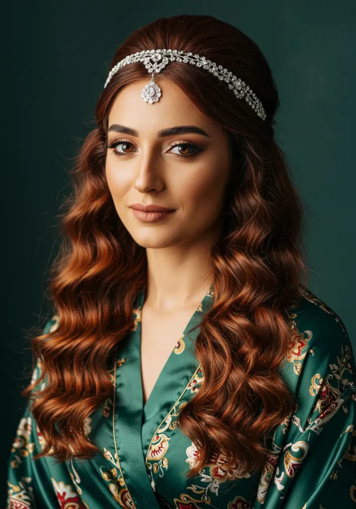 Rich auburn waves fall gracefully around the shoulders, topped with a rhinestone headpiece that adds instant sparkle and elegance. The deep red tones shine beautifully under warm lighting, making it a dreamy Christmas look.