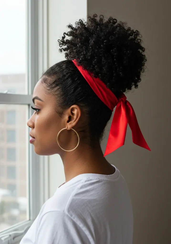 This look celebrates natural curls gathered high into a fluffy puff, tied with a bold red satin ribbon that makes it instantly festive. The texture is full and bouncy, giving the style height and personality while the ribbon adds that unmistakable Christmas charm.