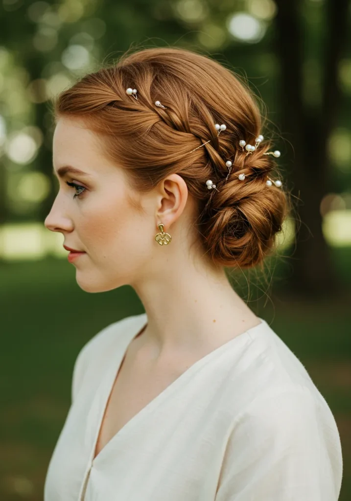 Smooth auburn hair is woven into a side braid that wraps beautifully into a low bun. Tiny pearl pins are tucked throughout, catching the light like fresh snowflakes. It’s classic, romantic, and absolutely holiday-ready.