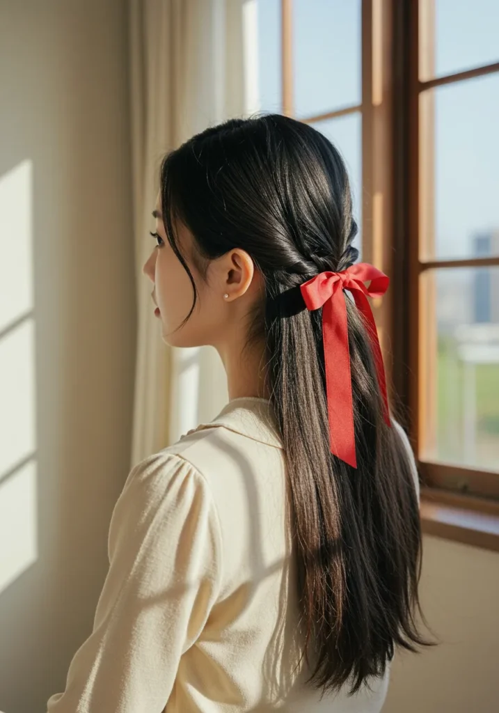 Long, sleek hair is gently twisted from both sides and secured at the back with a bright red ribbon bow. The rest of the hair flows straight and smooth, giving the whole look a sweet, polished finish.