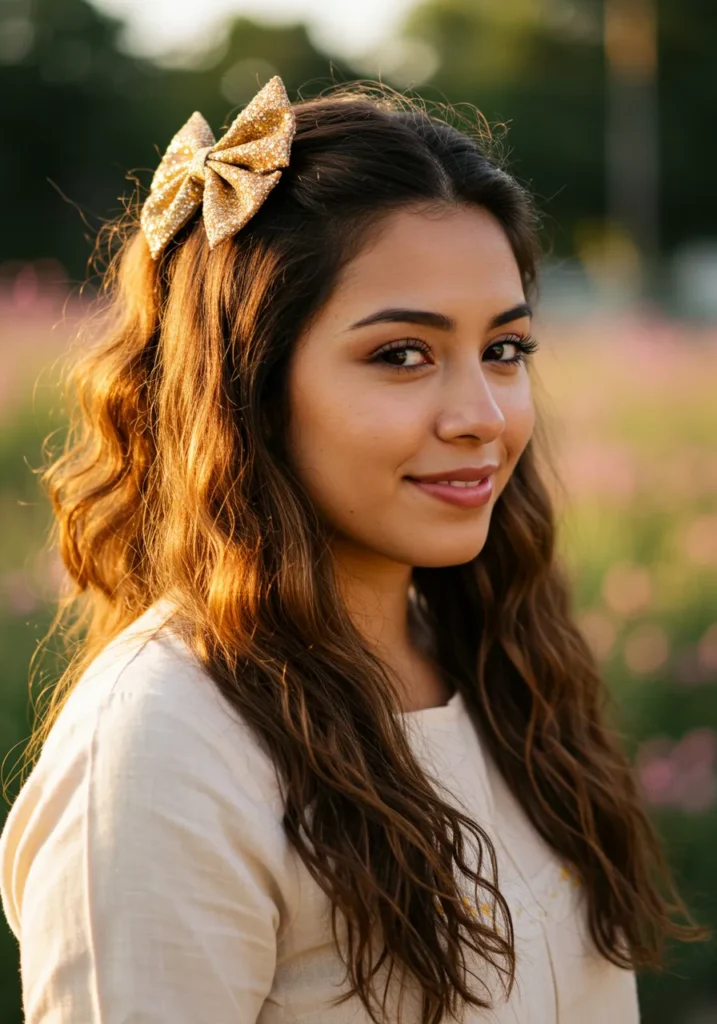 This one is pure joy in hair form. The bow is playful yet stylish, and the waves make me feel carefree and festive. It’s that easy “five-minute” hairstyle that somehow looks like you spent hours getting ready.