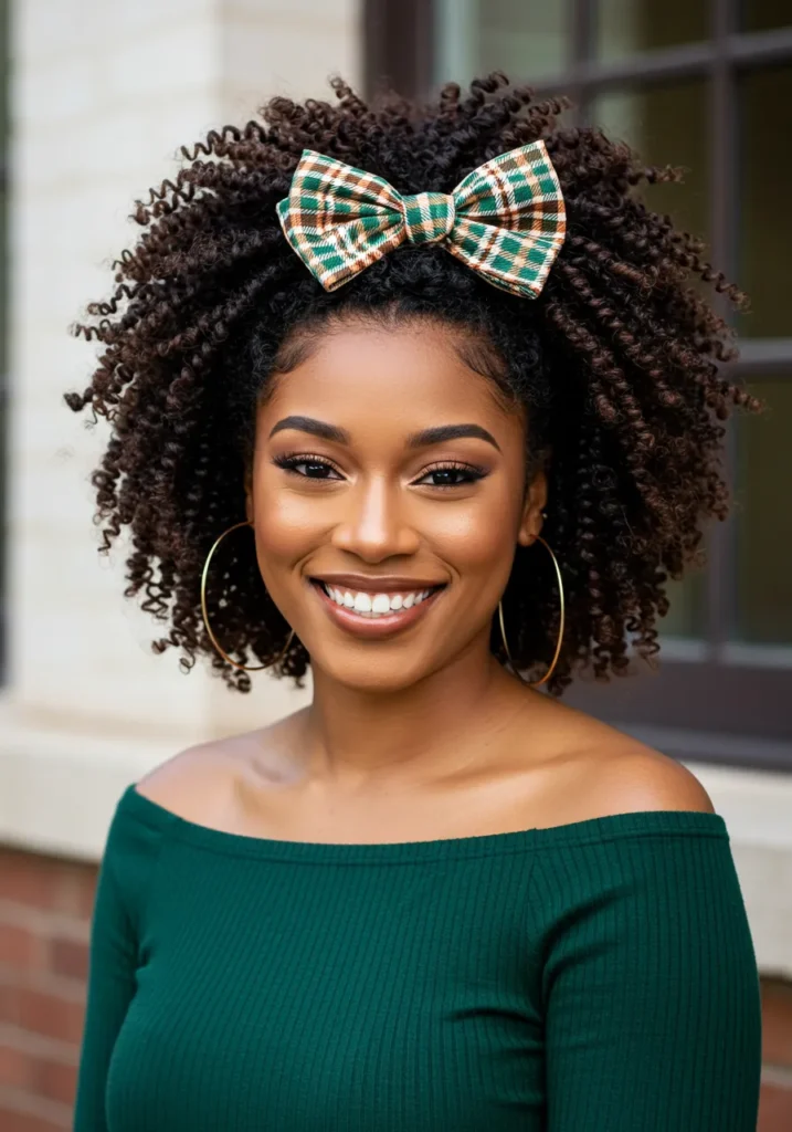 A joyful and bold hairstyle with voluminous curls pulled into a puff at the crown, finished with a big green-and-red plaid bow. The curls are tight, springy, and full of life, giving this look all the personality and cheer of the holiday season.
