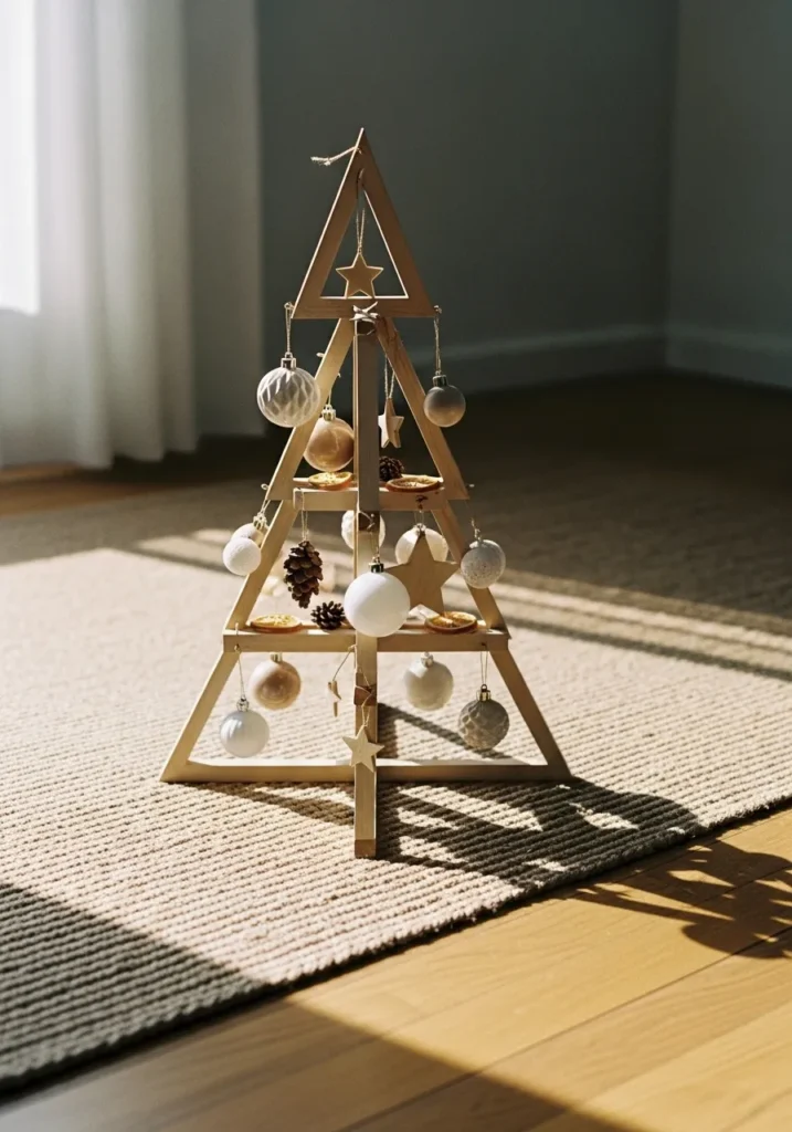 This charming minimalist tree swaps traditional branches for a sleek wooden frame shaped like a triangle, creating a clean and modern silhouette. The natural wood is left bare, which keeps the look light and airy, while neutral ornaments in shades of white, gold, and beige add a soft festive touch. A few pinecones tucked between the ornaments bring a hint of nature, and the sunlight streaming through the window makes the entire piece glow beautifully against the simple backdrop.