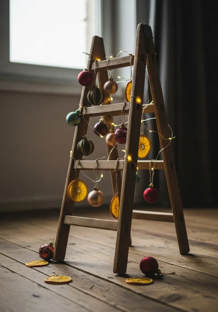 This clever little Christmas setup turns a simple wooden ladder into a festive statement piece. The warm wooden rungs are strung with glowing fairy lights and hung with a mix of colorful baubles and dried orange slices, creating that perfect balance of cozy and creative. The natural texture of the wood gives it a rustic charm, while the pops of red, green, and gold bring just enough sparkle to make it feel special. It’s the kind of idea that instantly brightens a room without taking up much space.
