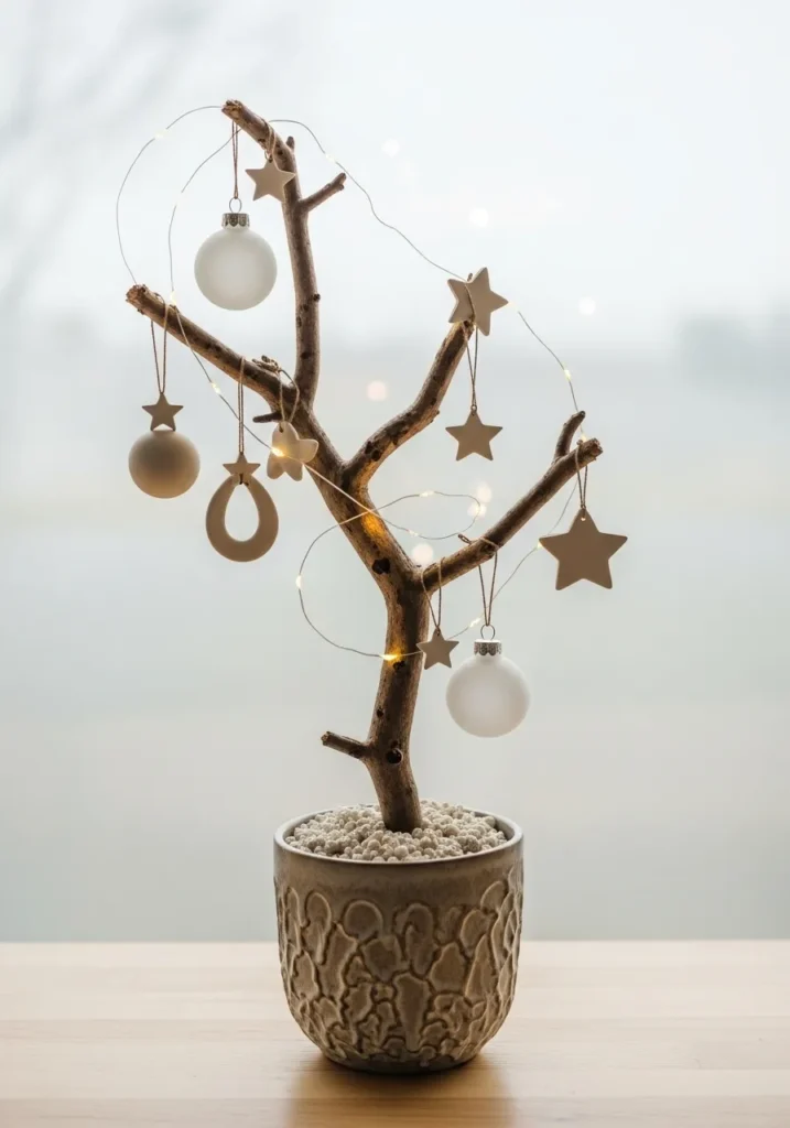 This charming little Christmas tree idea takes “less is more” to a whole new level. A single bare branch rises from a textured ceramic pot filled with soft white gravel, decorated with just a few neutral ornaments and dainty string lights. The soft matte tones of beige, white, and wood make it feel calm and effortless, like something straight out of a Scandinavian design catalog. It’s the kind of tree that brings peace instead of chaos, perfect for anyone craving a gentle touch of festive magic without the clutter.