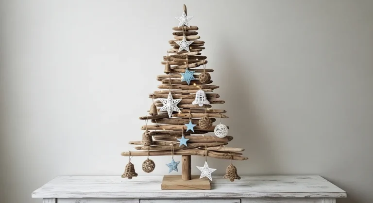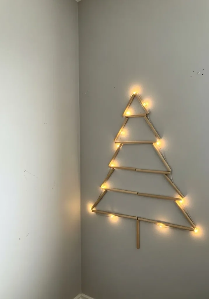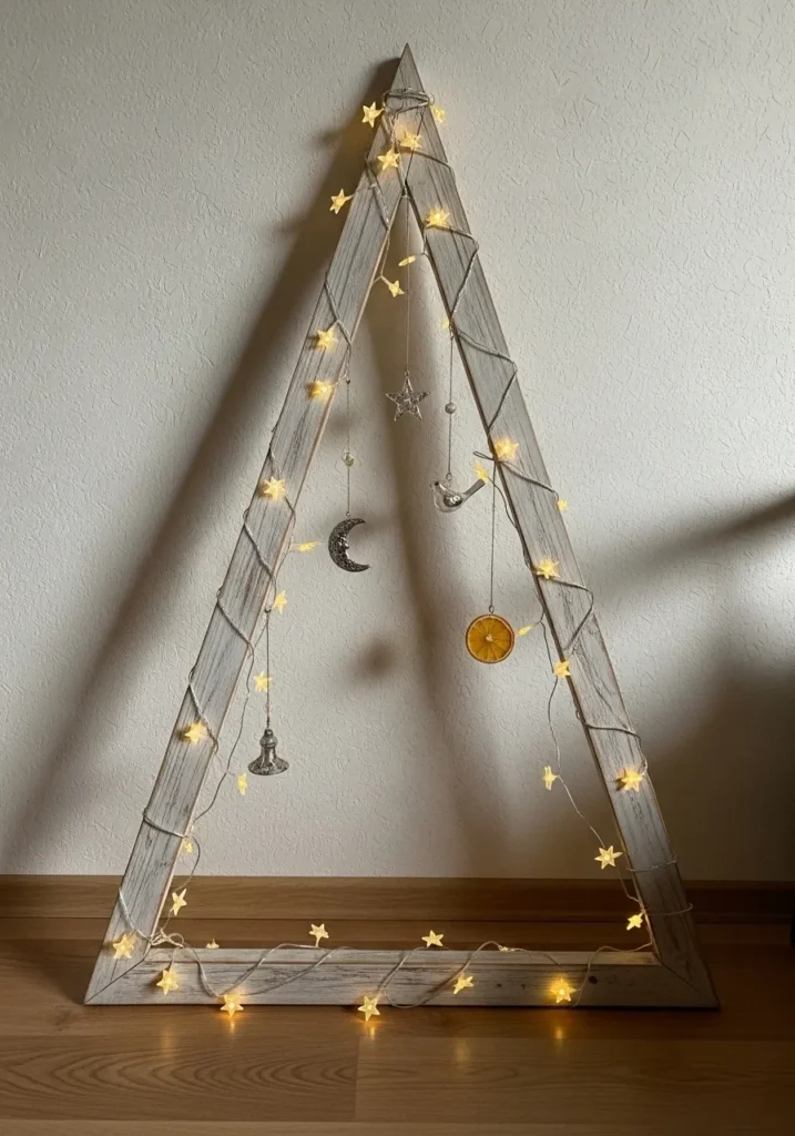 This creative Christmas tree idea turns simplicity into pure magic. Made from light wood shaped into a tall triangle frame, it’s strung with delicate star-shaped fairy lights that glow softly against the wall. A few charming ornaments hang gently from the top bar — a moon, a star, a little bell, and even a slice of dried orange that adds the perfect touch of rustic whimsy. The overall look feels effortlessly airy and modern, yet still warm and festive.