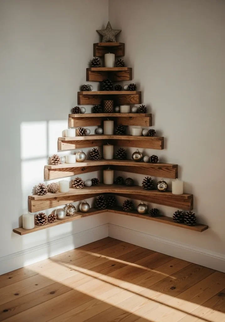 This clever corner shelf tree design is the perfect space saver for anyone who wants a festive touch without sacrificing floor space. Built from warm, natural wood planks arranged in a tiered triangular shape, it mimics the silhouette of a classic Christmas tree. Each shelf is styled with simple accents like pinecones, candles, and metallic ornaments, creating a look that feels both rustic and modern. The soft sunlight brushing over the wooden texture adds such a cozy, organic feel that it’s hard not to smile at how effortlessly stylish it looks.