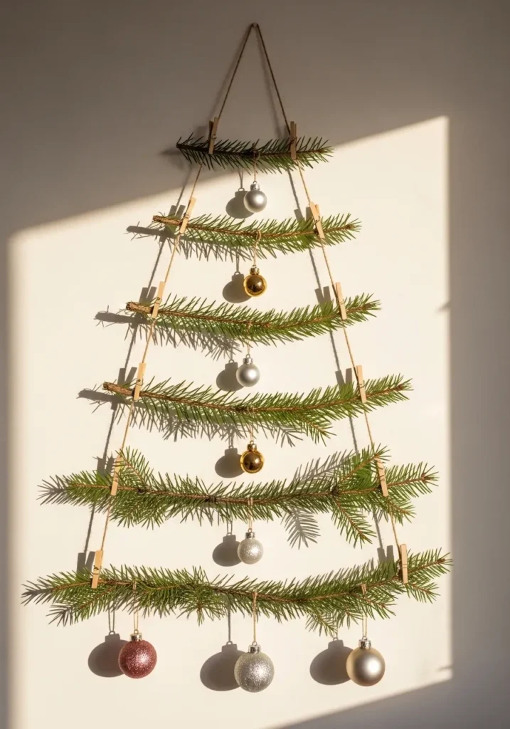 This minimalist wall tree idea proves that you don’t need a full pine to feel festive. Made from simple twine, fresh fir branches, and a few metallic ornaments, it’s the perfect blend of rustic charm and modern simplicity. The branches are clipped in a triangular shape using tiny wooden clothespins, creating that unmistakable Christmas tree silhouette without taking up an inch of floor space. When sunlight hits it, the ornaments cast soft, shimmering shadows that make the whole thing feel cozy and effortless.