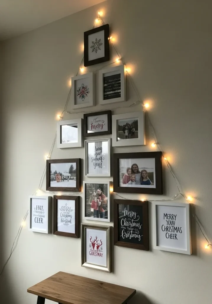 This creative Christmas tree idea turns a simple wall into a festive focal point using framed photos and art arranged in a triangular tree shape. The mix of black, white, and wood-tone frames gives it a cozy yet modern feel, while warm fairy lights trace the outline of the tree, adding a gentle holiday glow. Each frame holds a mix of family photos and cheerful holiday prints, creating a personal and heartwarming take on seasonal decorating.