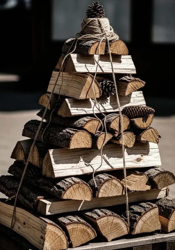 This clever Christmas tree idea swaps branches for stacked firewood, creating a charmingly rustic silhouette that feels both warm and inventive. Cut logs are arranged in graduating layers, forming a perfect tree shape that highlights the natural textures of bark and wood grain. A spool of twine and a few pinecones act as simple yet beautiful accents, adding that woodland touch without overwhelming the design. The whole look gives off cozy cabin vibes and would fit perfectly in a farmhouse or minimalist space.