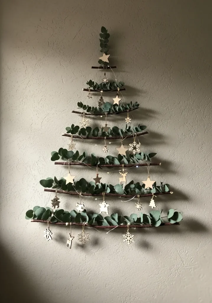 This minimalist wall tree feels like the perfect blend of nature and creativity. Simple wooden sticks are arranged in a tiered triangle shape, each layered with sprigs of fresh eucalyptus for that soft green texture and calming scent. Tiny wooden ornaments in star and snowflake shapes hang gently between the branches, catching the light in the most subtle, cozy way. It’s clean, organic, and perfectly understated for anyone who loves natural holiday styling.