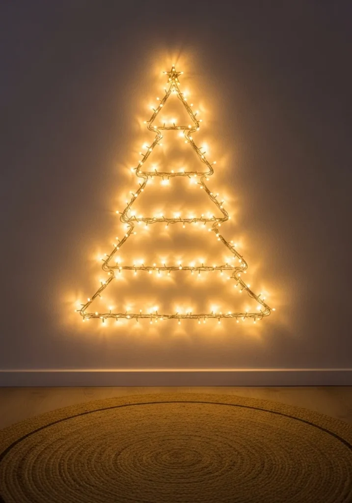 This design proves that you don’t need pine needles or ornaments to create holiday magic. A simple outline of a Christmas tree made entirely from warm fairy lights brings an instant cozy glow to any wall. It’s modern, minimalist, and perfect for small spaces. The soft golden hue reflects gently off the neutral wall, creating a calm, elegant holiday vibe that feels both festive and serene.