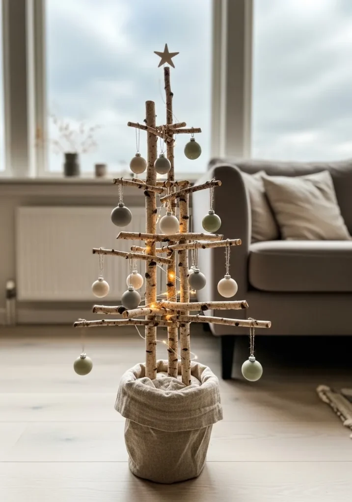 This clever little tree is made entirely of stacked birch branches, giving it that rustic yet modern Scandinavian charm. The branches are arranged in a perfect minimalist silhouette, dotted with simple matte ornaments in muted tones of cream, gray, and sage. A soft linen pot cover grounds the base, while a tiny wooden star crowns the top, tying the whole natural look together. It’s the kind of design that feels both earthy and effortlessly stylish, especially in a bright living room with cozy neutrals and plenty of natural light.