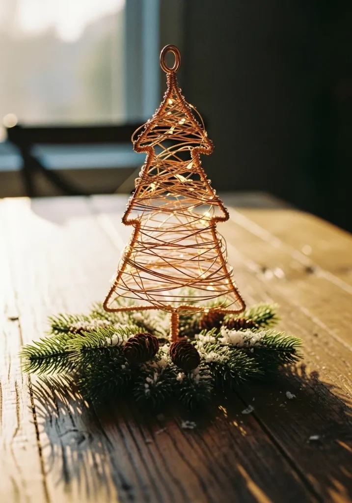 This little tabletop beauty feels like it was made from pure Christmas sparkle. A slender frame of twisted copper wire forms a minimalist tree shape, and it’s softly wrapped in warm fairy lights that glow like fireflies caught in a snow globe. At its base, a simple wreath of pine sprigs and tiny cones adds that cozy woodland touch, balancing the metallic shine with a hint of nature. The whole piece looks even dreamier as the golden hour light hits the surface, making the copper gleam.