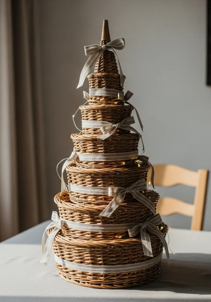 This charming little tree swaps traditional pine for woven wicker baskets stacked in a perfect cone shape. Each layer is wrapped with soft beige ribbons tied into delicate bows, and a few twinkling fairy lights peek through the weave to add that cozy golden glow. The warm texture of the wicker makes it feel earthy and rustic, while the balanced symmetry gives it a touch of modern polish. It’s a clever mix of farmhouse charm and minimalist elegance, making it a lovely alternative for anyone craving something a bit different this season.