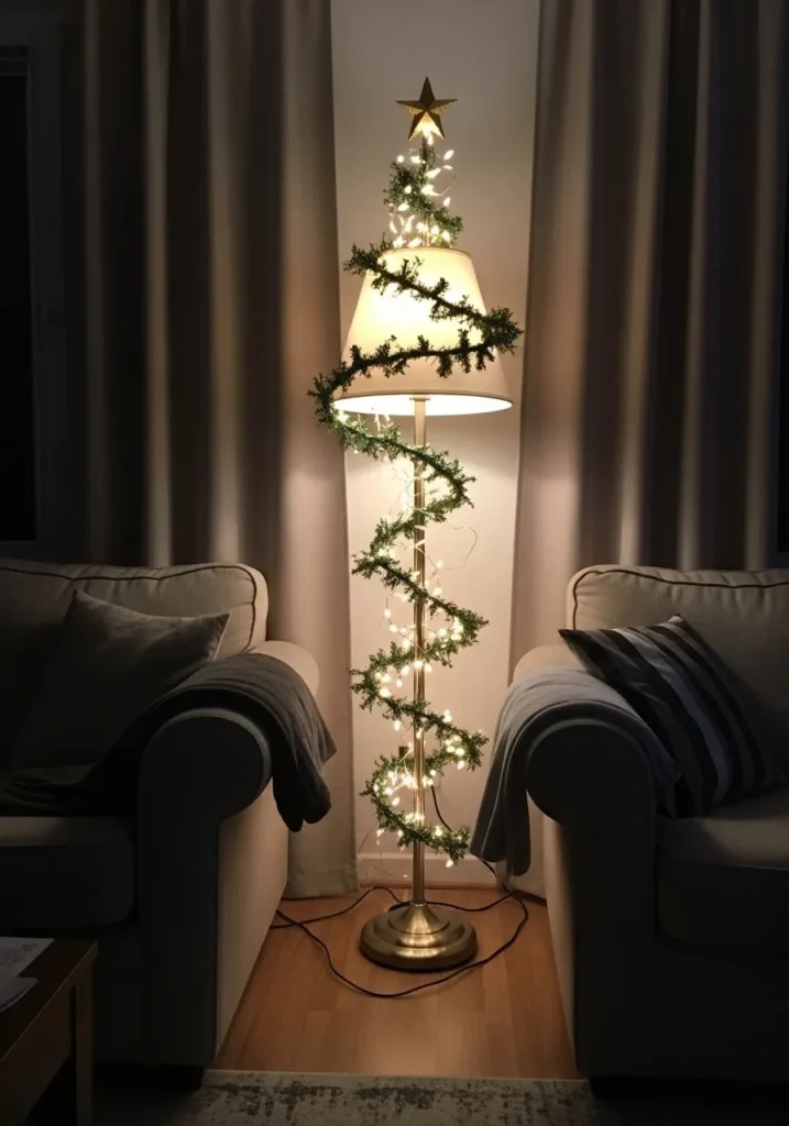 This design turns an ordinary floor lamp into a charming Christmas statement that feels both clever and cozy. A simple gold lamp becomes the centerpiece once it’s wrapped in a twinkling garland and fairy lights, topped with a glittery star for that festive finishing touch. The soft glow from the lamp blends beautifully with the warm string lights, creating a gentle, golden shimmer that makes the whole corner feel magical. It’s the perfect setup for small spaces where every bit of sparkle counts.