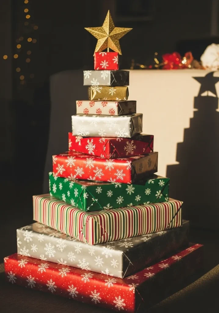 This clever Christmas tree idea swaps branches for beautifully wrapped presents stacked from largest to smallest, forming a perfect festive pyramid. Each box is covered in shimmering paper—think red, green, gold, and silver with snowflake and stripe patterns—that catches the soft glow of holiday lights. Topped with a glittering star, it gives the illusion of a classic Christmas tree but with a modern, minimalist twist that’s equal parts charming and resourceful.