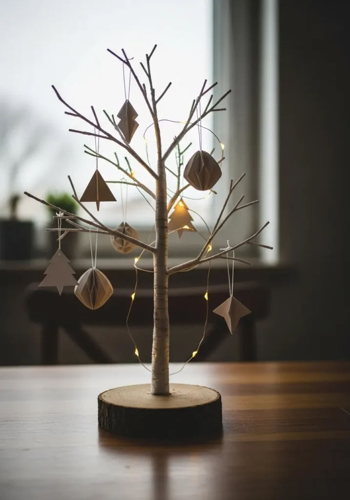 This sweet little tabletop tree feels like the perfect balance of simplicity and charm. Made from a slender branch anchored in a rustic wooden base, it’s dressed with folded paper ornaments in soft neutral tones and wrapped with delicate fairy lights that glow just enough to make everything feel cozy. It’s modern, airy, and quietly festive without taking up too much space or shouting for attention.