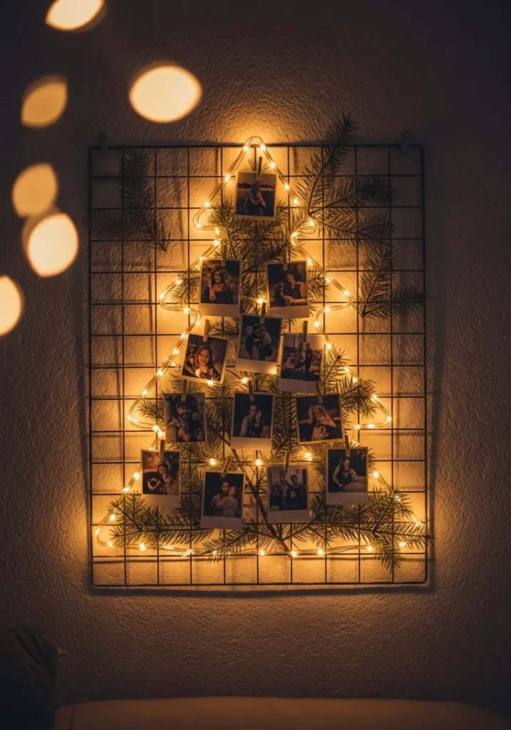 This design turns a simple wire grid into a glowing Christmas statement piece. Wrapped in warm fairy lights and shaped like a Christmas tree, it’s layered with sprigs of greenery and clipped Polaroid photos that tell a story all on their own. The soft lighting against the wall creates a cozy, golden glow that feels nostalgic and modern at the same time. It’s minimal, sentimental, and incredibly easy to pull off in small spaces.